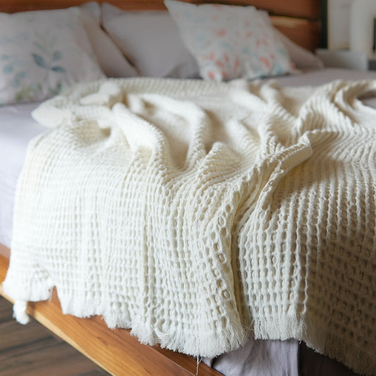 Waffle Weave Throw with Fringes, 50"x 60", 100% Fresh Cotton, Ivory
