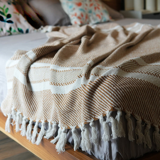 Herringbone Weave Throw with Tassels, 50"x 60", Recycled Cotton, Camel Brown