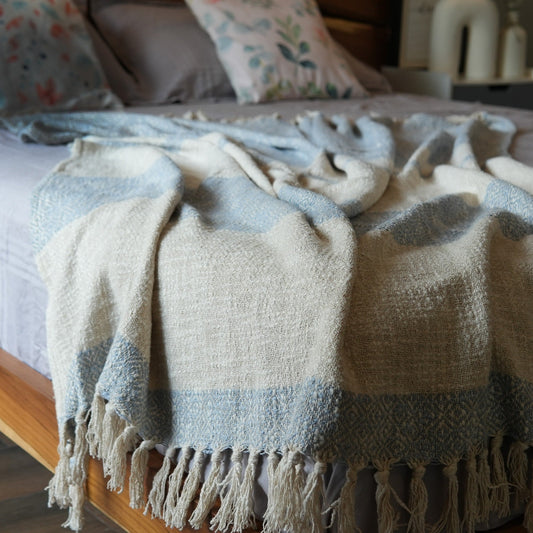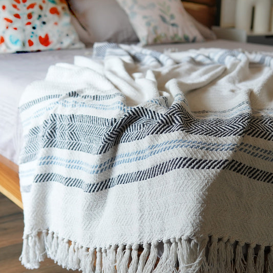 Herringbone Weave Throw with Tassels, 50"x 60", Recycled Cotton, Ivory Blue