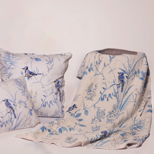 100% Cotton, 4 layer Printed Muslin Throw Blanket - Botanical Blue