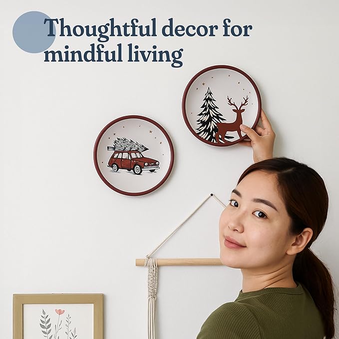 - EASY TO HANG – These lightweight Christmas decorative plates come with sturdy built-in double hooks for hanging, so you only need to preset small nails on the wall—no complex tools required. Perfect for rustic Christmas decorations, boho or rustic wall art, western home decor, fall wall decor, and as a charming plate set to elevate any space.