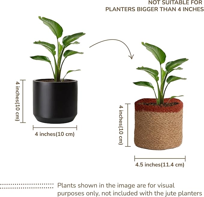 These jute planters, measuring 4.5"x4.5"x4", are designed to fit 4-inch plant pots, making them an ideal choice for both indoor and outdoor décor. Ideal for retailers looking to buy jute planters in bulk.